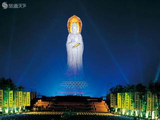海上观音:南山海上观音圣像被设计为正观音的一体化三尊造型,从每尊的正面看均是一尊观音圣像,环绕一周方可看清三尊手势各异的观音圣像全貌,是观音化身和观音法门的综合体现,象征着东方世界“慈悲”、“智慧”与“和平”。
